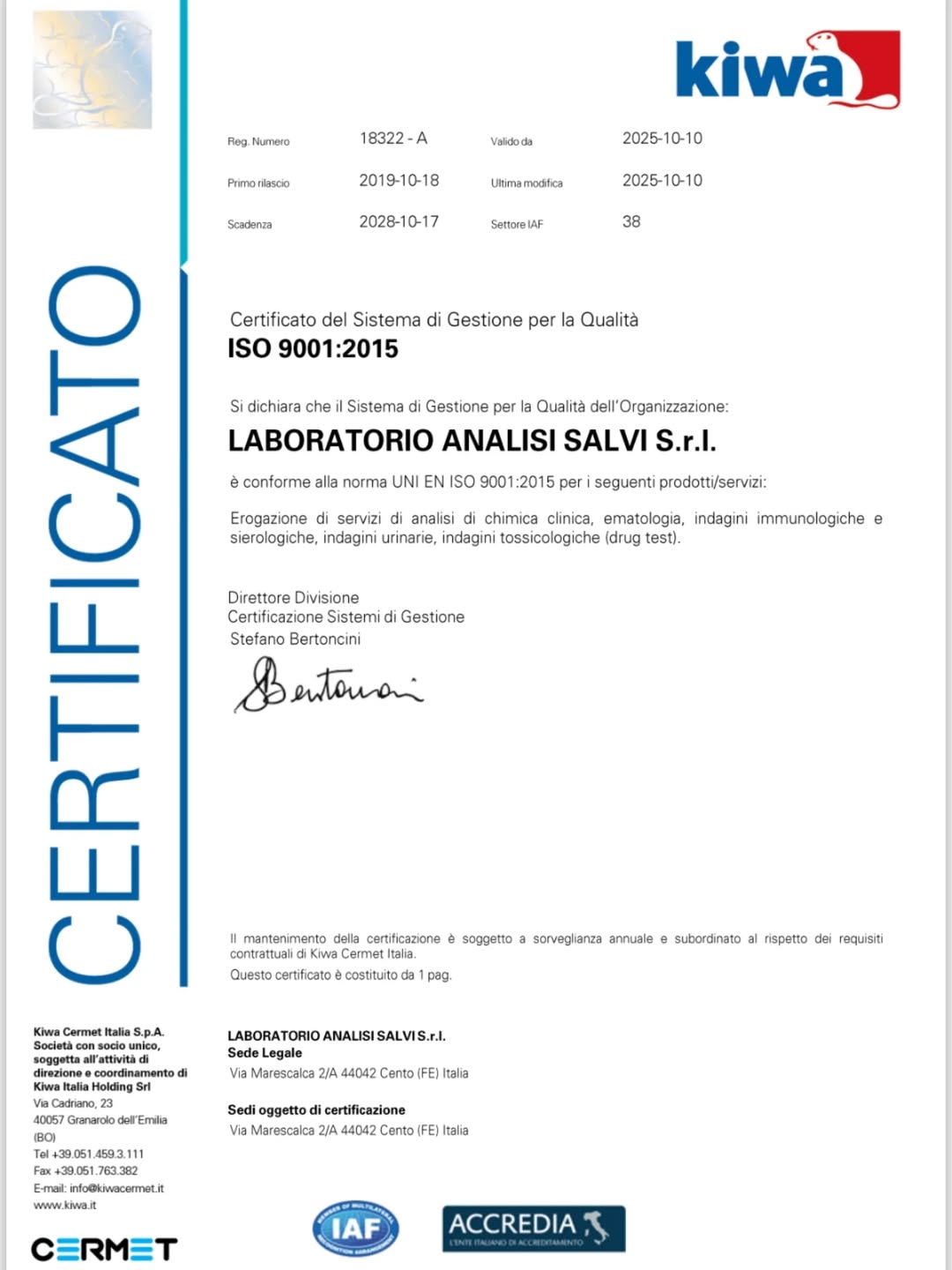 Anche quest'anno abbiamo ottenuto la certificazione per la gestione della qualità del Laboratorio,  dimostrazione che l'impegno nel lavoro viene ripagato!